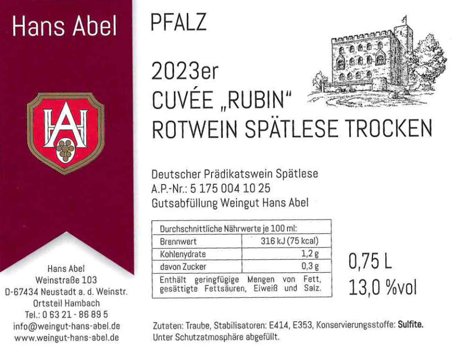 Unser Cuvée "RUBIN" präsentiert sich kraftvoll und charakterstark mit 13 % vol Alkohol. Ein ausgeprägtes Bouquet von reifen dunklen Beeren, Kirschen und feiner Würze prägt das aromatische Profil und verleiht dem Wein seine markante Ausdruckskraft.